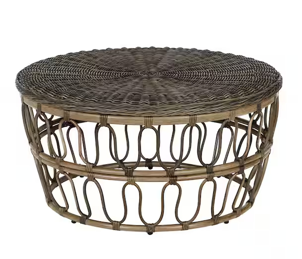 • Furnish your veranda with this Hampton Bay GIA round wicker outdoor accent table. The natural brown finish and wicker weave pattern deliver a cozy look, giving your deck a warm, relaxing vibe. Instead of traditional straight legs, this outdoor table features a rounded base for unique, eye-catching flair. The all-weather resin wicker maintains its form and finish with the changing seasons, holding up well against heat, cold and rain. This Hampton Bay GIA round wicker outdoor accent table has a powder-coated steel frame for dependable rust resistance.