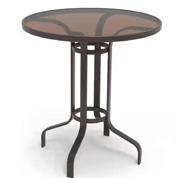 • Riverbrook Espresso Brown Round Glass Top Aluminum Outdoor Balcony Bistro Table Is the perfect table to add to your outdoor space. Combine it with the 2-pack balcony chairs and create a space that you are sure to enjoy all summer long. Made of aluminum, this table is both rust and weather and rust resistant.