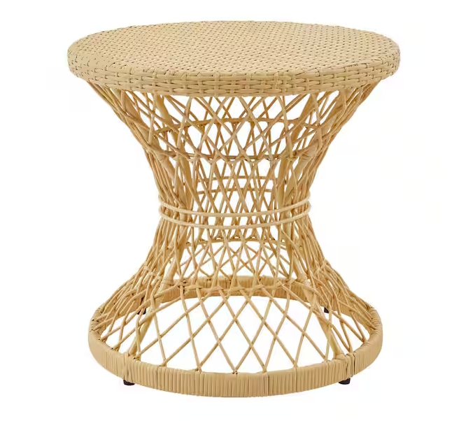 • Furnish your balcony with this 20-inch Hampton Bay woven yellow round metal and wicker outdoor side table. The cheery yellow finish gives your space a bright, lively vibe, while the hourglass shape and twisting wicker pattern offer charming appeal. Propped by a rust-resistant, powder-coated steel frame, this side table endures volatile temperature changes and outdoor conditions. An all-weather polyethylene wicker withstands cold, heat, humidity and rain for dependable longevity. This pre-assembled Hampton Bay woven yellow round metal and wicker outdoor side table is ready for use.